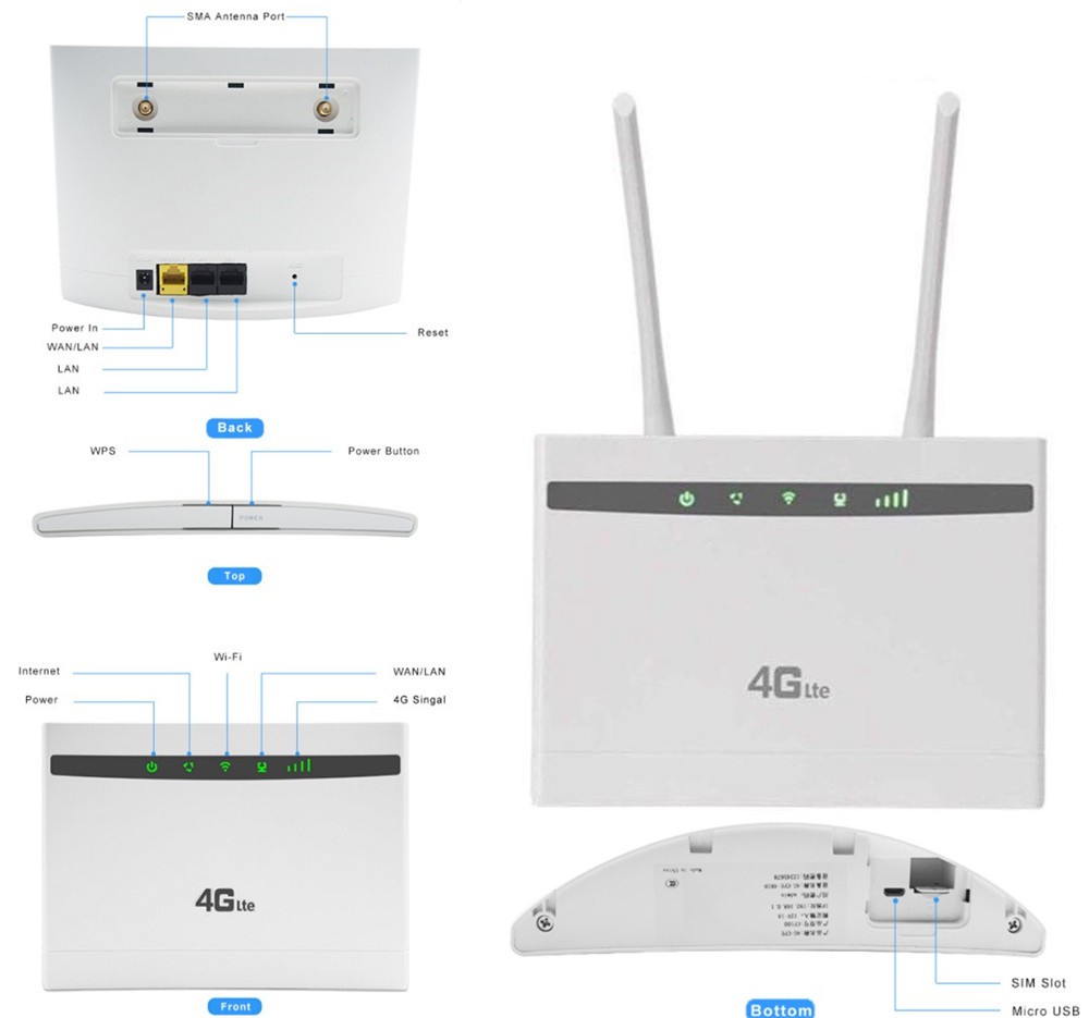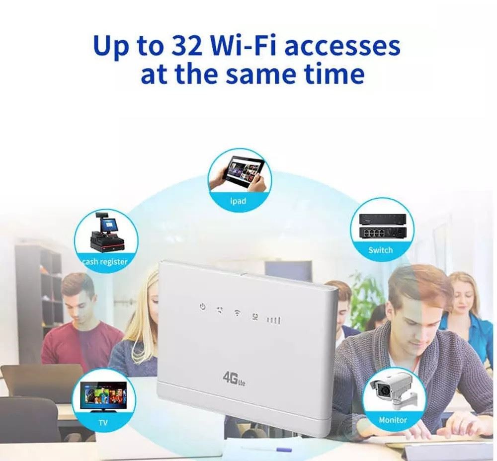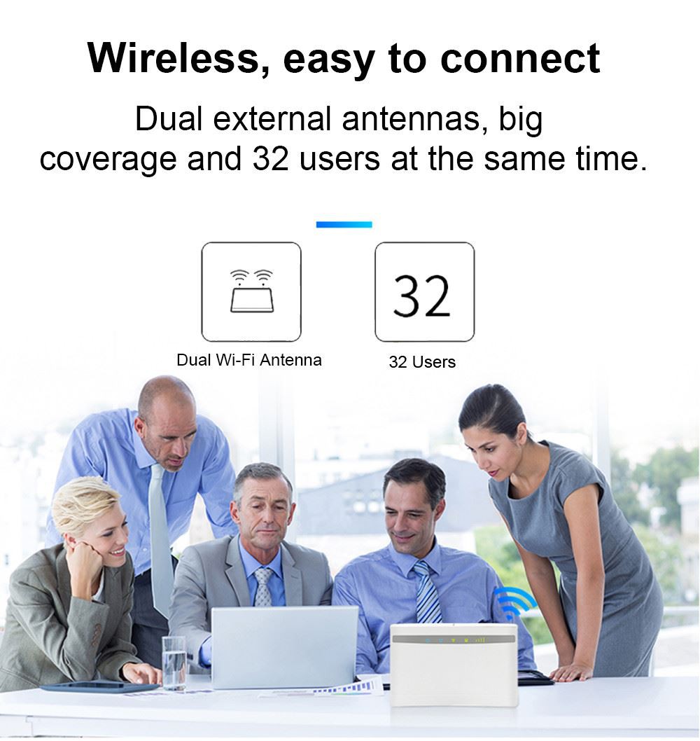 To je zelo napreden LTE notranji CPE usmerjevalnik. Zasnovan je tako, da zadovolji potrebe po integriranih podatkih in Wi-Fi zmanjšanju dostopa do Fi za rezidenčne, poslovne in poslovne uporabnike. (lahko se poveže z zunanjimi antenami s priključkom SMA!) 150M visoka hitrost, LTE FDD: DL/UL 150M/ 50 Mbps (Cat 4). Prenesite 4G na Wi, zmanjšajte Fi, ni potrebe po širokopasovnem dostopu, vstavite kartico SIM, priključite in igrajte. WiFi Pokriva celotno stanovanje in hišo, uživajte v hitrem internetu povsod. Enostavna povezava, dve zunanji anteni, velika pokritost in 32 uporabnikov hkrati.